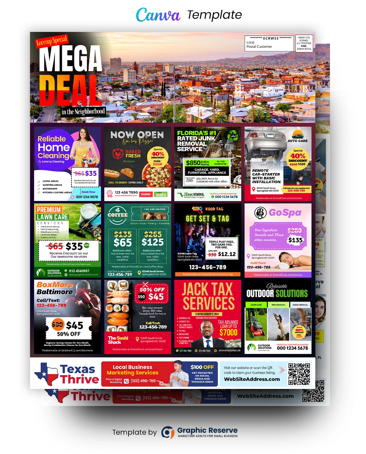 Create a 15×12 Co-op EDDM postcard in Canva. Ideal for shared mailers with 8–10 business ads. Fully editable, print-ready, and easy to customize.
