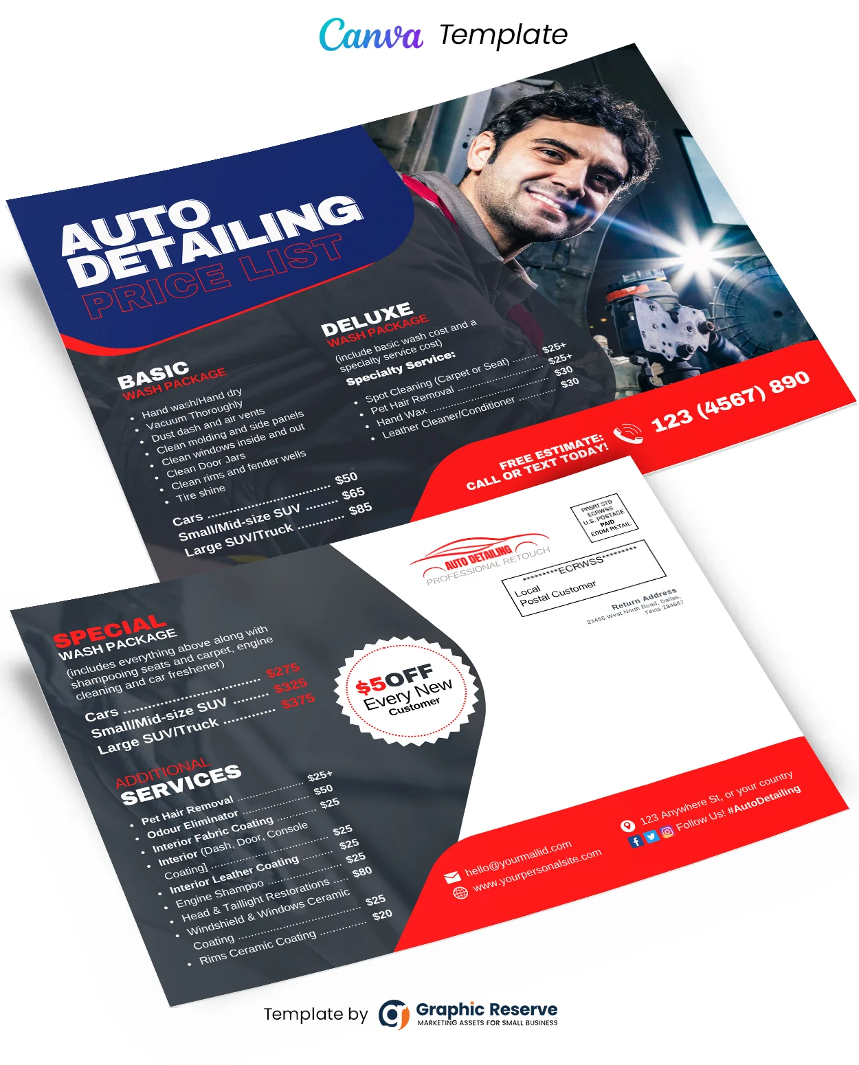 Auto Detailing Pricing EDDM Design Template. Automobile’s eddm postcard marketing template idea for car washes, garages, auto detailing services, valets, dealerships, repair shops, and other automotive businesses. Boost your company’s sales and attract new customers! all in an online easy customizable canva direct mail template.
