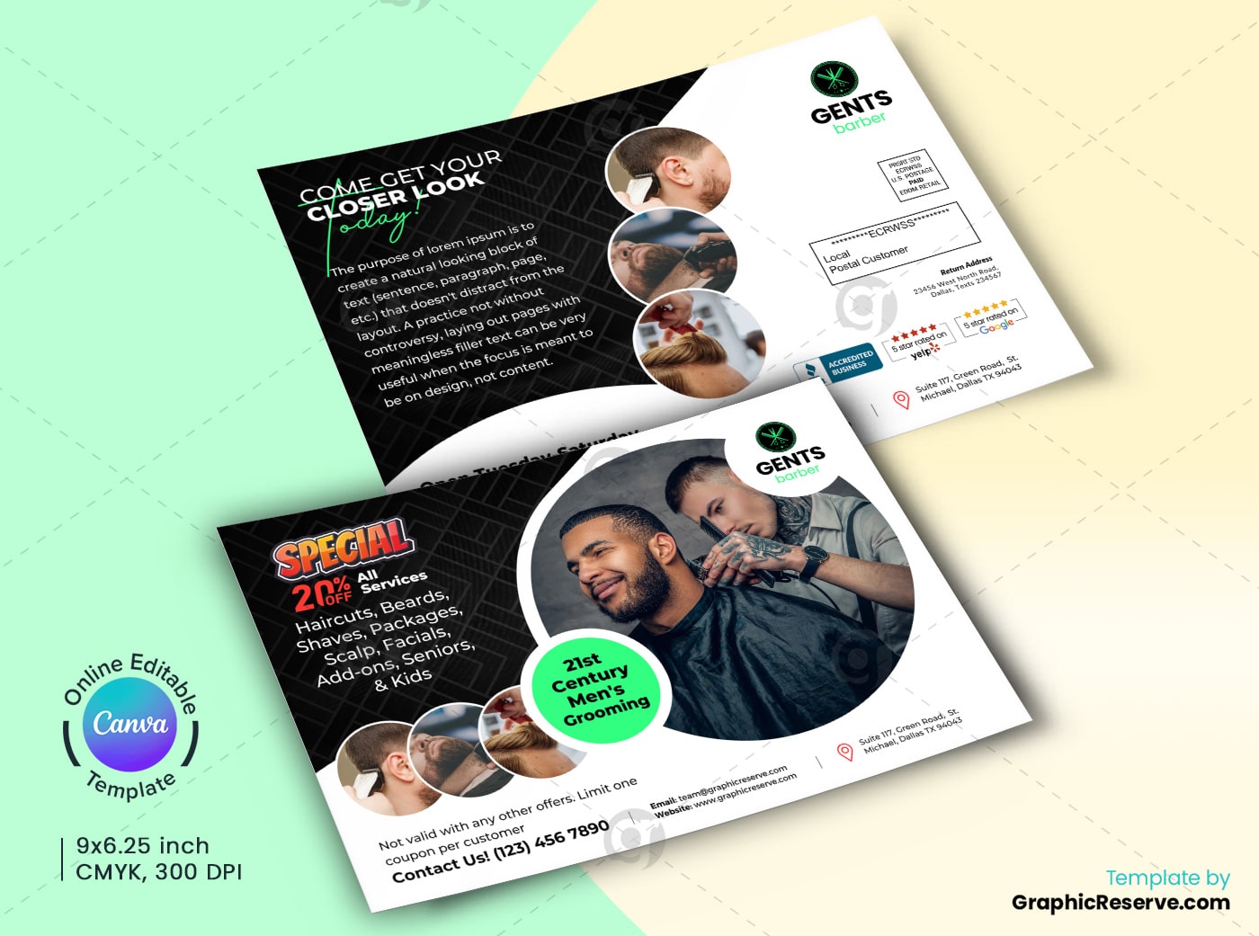 Barber Shop Canva Canva EDDM Postcard This template is specially designed for Salon services, You can definitely use this template for any other Services if you want. Fully editable, image/logo can be quickly added or replaced in Canva.