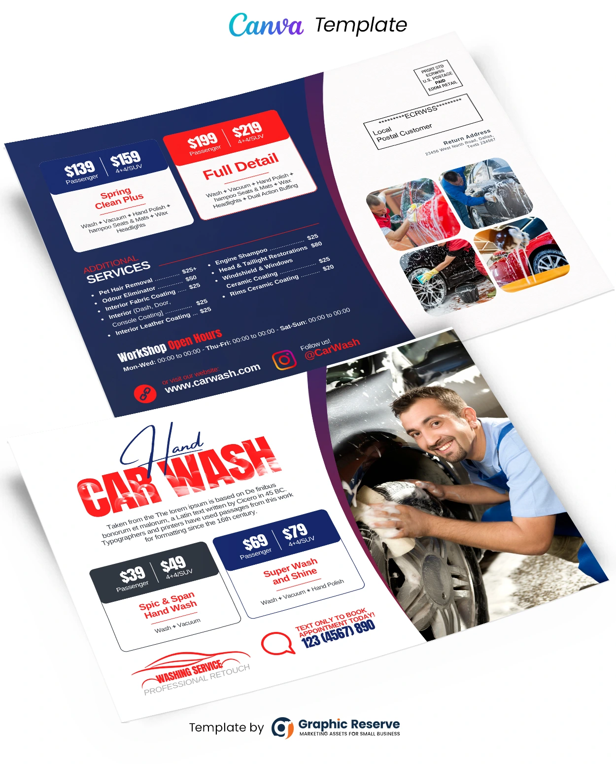 Car Wash EDDM Postcard Design Template. Automobile’s eddm postcard marketing template idea for car washes, garages, auto detailing services, valets, dealerships, repair shops, and other automotive businesses. Boost your company’s sales and attract new customers! all in an online easy customizable canva template