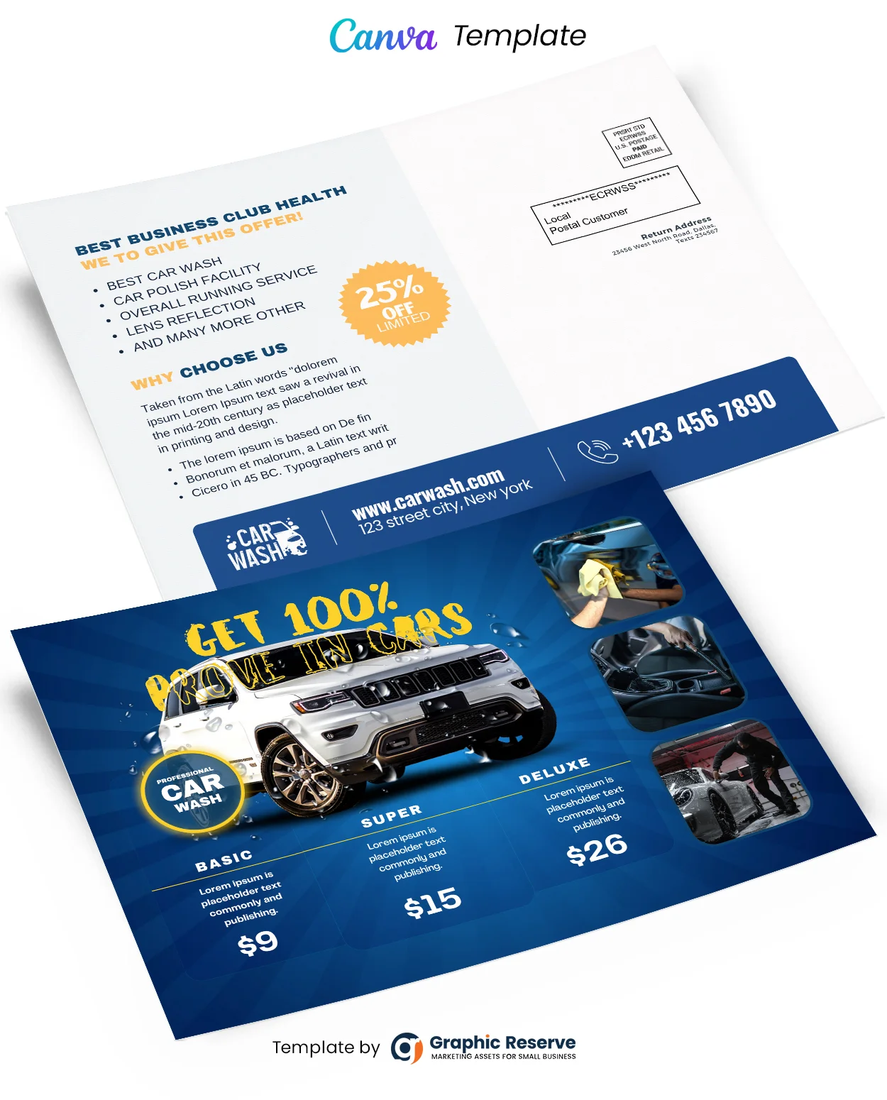 Perfect for car wash businesses looking to promote their services to local customers. Start designing your custom direct mail postcard today!