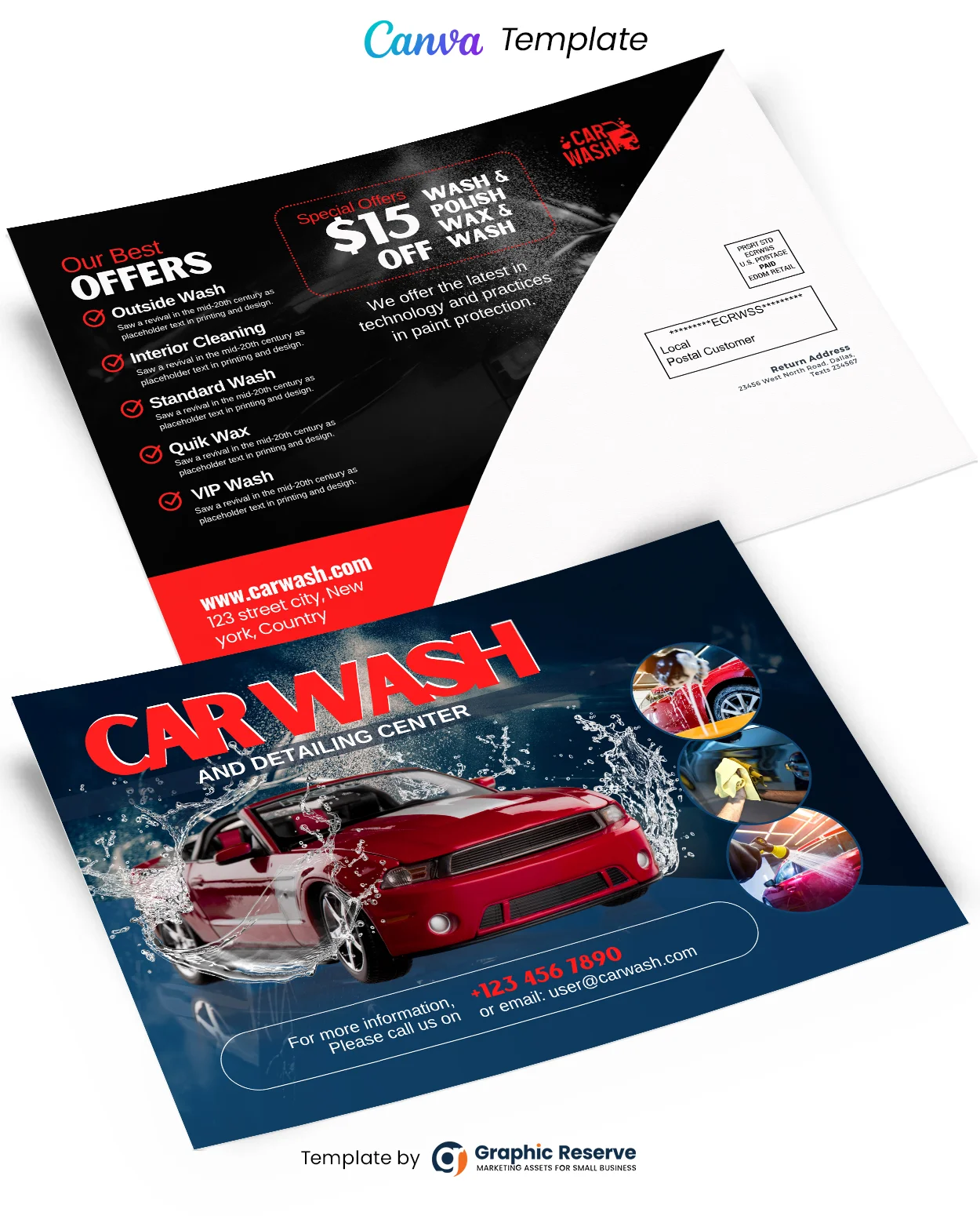 Boost your car wash business with this customizable EDDM postcard template, designed for seamless editing in Canva. This template allows you to easily personalize the design with your services, pricing, and special promotions, making it the perfect tool for reaching local customers and increasing your visibility.