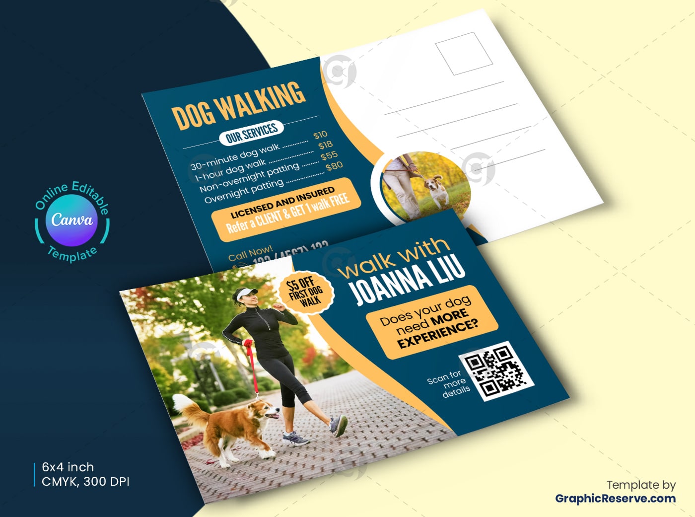 Dog Walking Postcard This template is specially designed for Pet care agencies, You can definitely use this template for any other services if you want. Fully editable, image/logo can be quickly added or replaced in Canva.