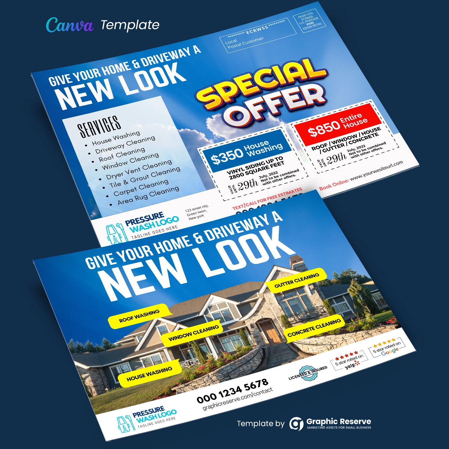 Exterior cleaning direct mail marketing postcard design Canva template.