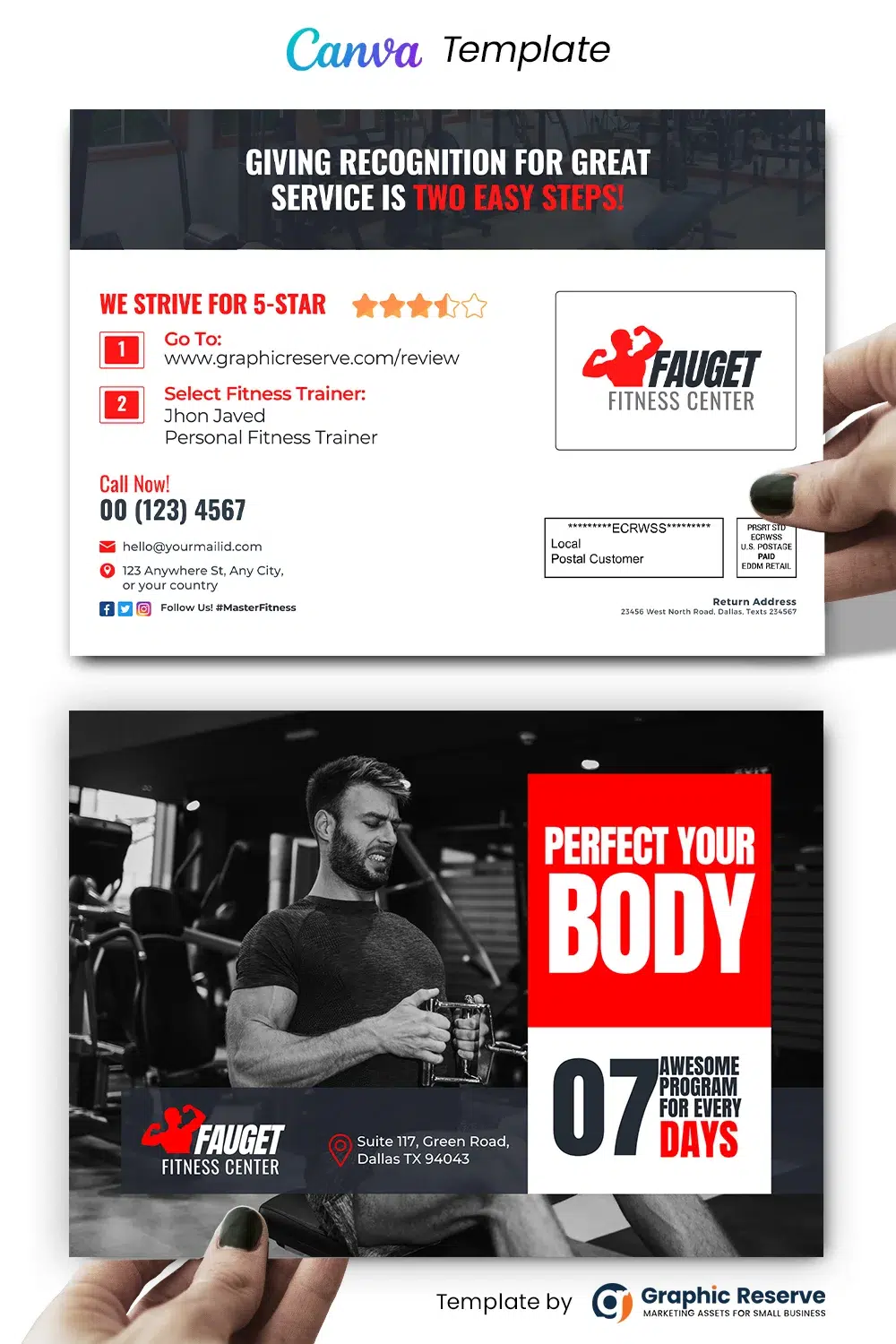 Gym EDDM google Review Postcard Design Template. (ge4) This is a fitness & health eddm mailer. I would recommend this multipurpose postcard template for the marathon, club, party, health, fitness, bodybuilding, gym, training, sports club, dance studio, martial arts, yoga, boxing, and all other fitness-related businesses. This template is in fully online editable canva files, All elements are easily editable and customizable.