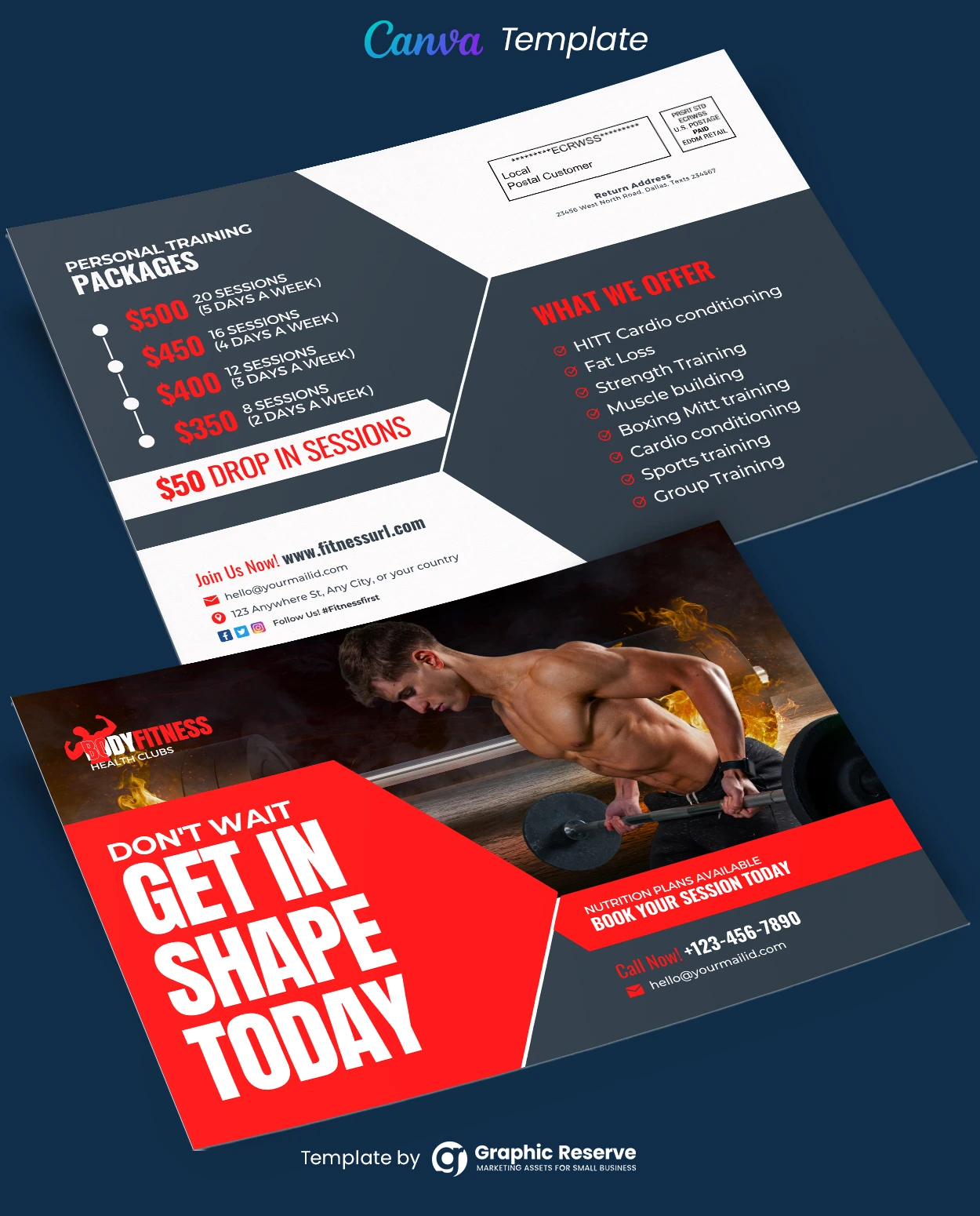 This is a fitness & health eddm mailer. I would recommend this multipurpose postcard template for the marathon, club, party, health, fitness, bodybuilding, gym, training, sports club, dance studio, martial arts, yoga, boxing, and all other fitness-related businesses. This template is in fully online editable canva files, All elements are easily editable and customizable.