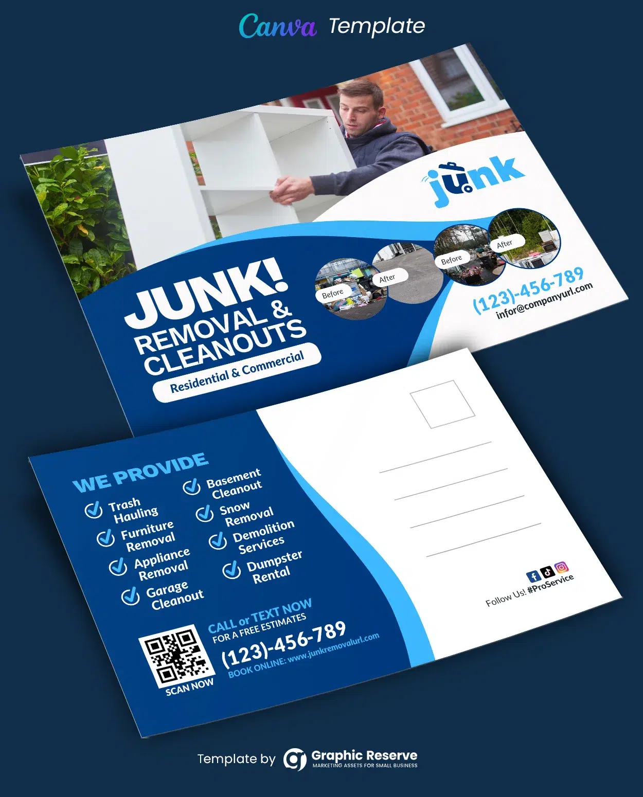Junk Removal Canva Postcard Design This template is designed for interior and exterior junk removal and cleaning services. You can definitely use this template for any other services if you want. Fully editable, image/logo can be quickly added or replaced in Canva