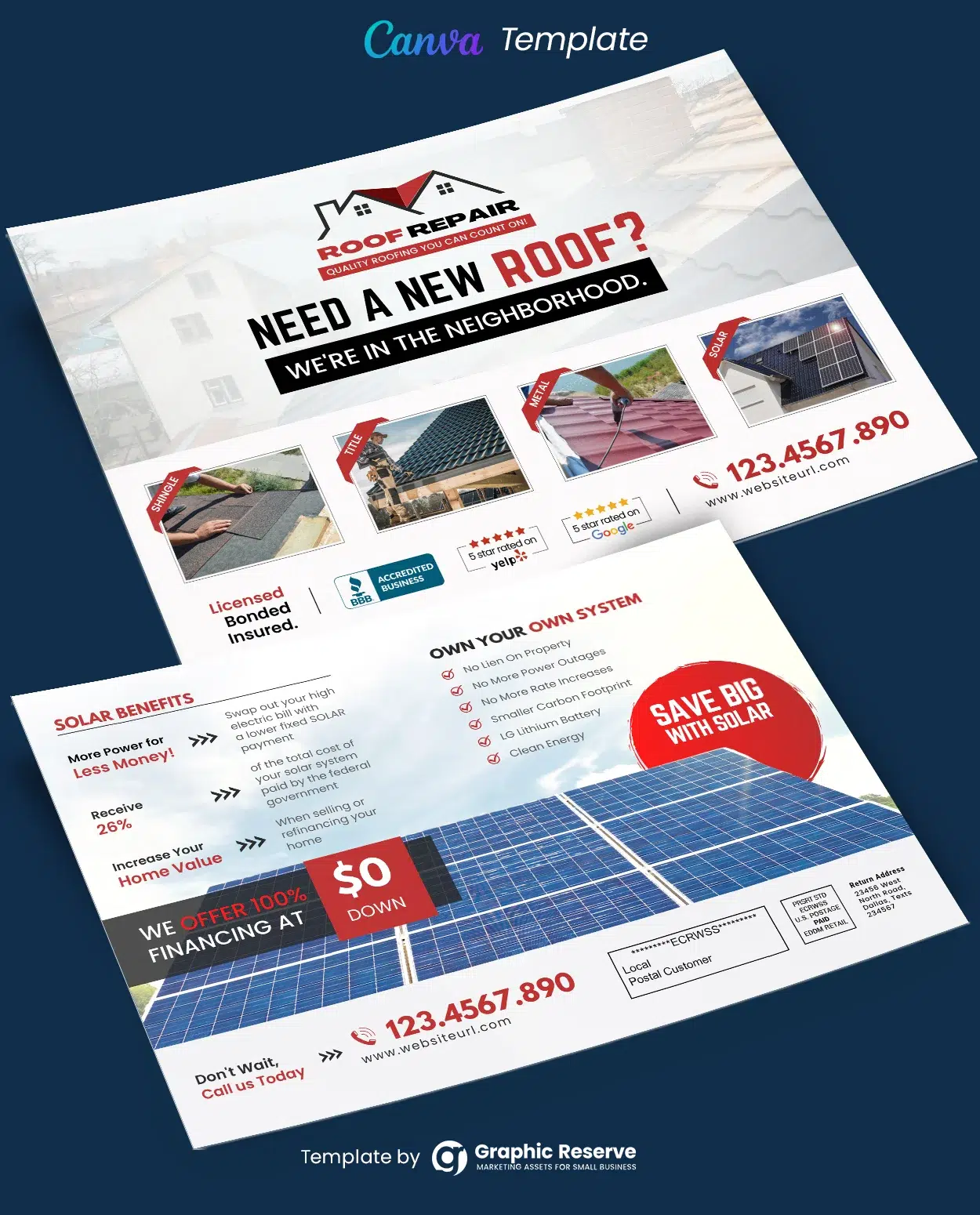 Roof installation and repair service EDDM Mailer templates are specially designed for Roofs Services. You can definitely use this template for any other Service if you want. You can easily edit this template with your own details. The images, texts, and colors are fully editable and quickly replaced in canva.